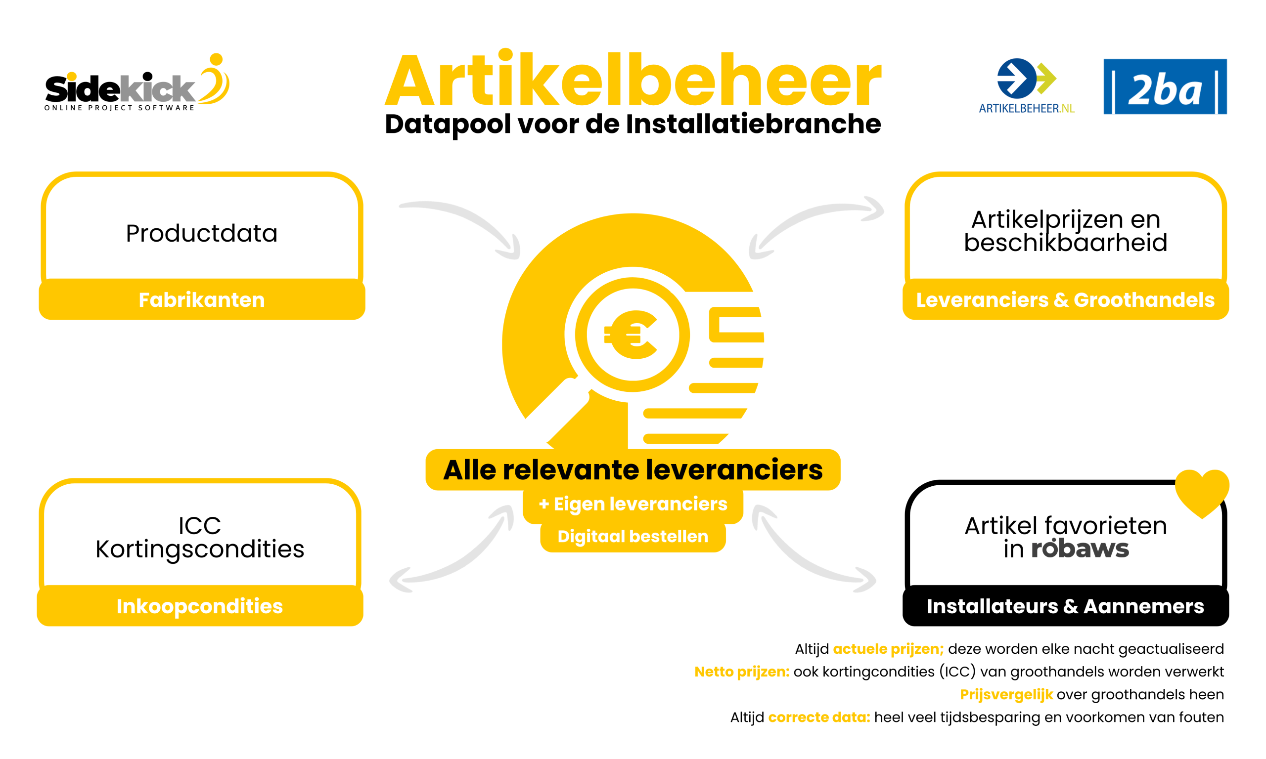 Voor de installatiebranche garandeert de integratie met 2ba, Artikelbeheer.nl en leveranciersportals zoals Technische Unie en Rensa, het gebruik van correcte artikelgegevens met actuele prijzen in onze calculatiesoftware voor de installatiesector. Digitale communicatie via de DICO-standaard levert hoge efficiency.